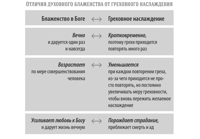 Чтобы наглядно показать разницу между греховным удовольствием и блаженством в Боге, давайте обратимся к сравнительной таблице, в которой обозначены свойства обоих состояний.